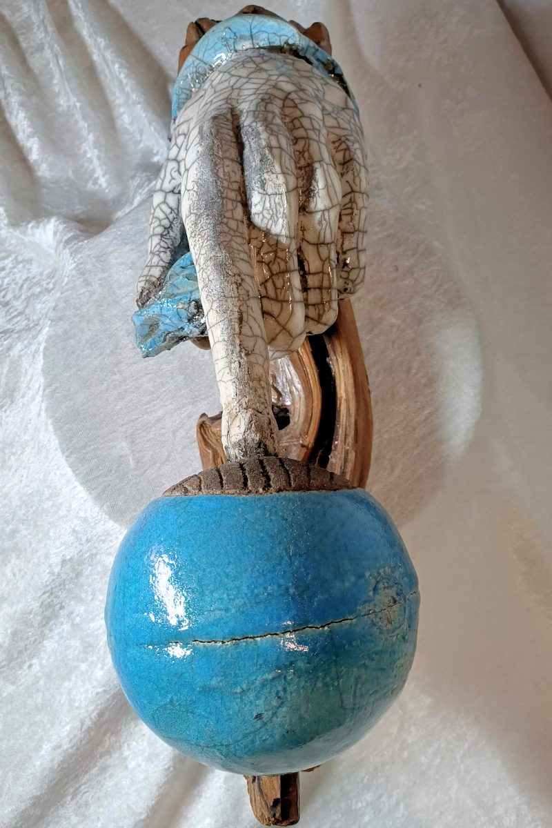 Réalisée en argile selon la technique du Raku, cette œuvre associe matière, feu et imprévu. Les textures organiques et les contrastes renforcent le lien entre l’Homme et la nature.